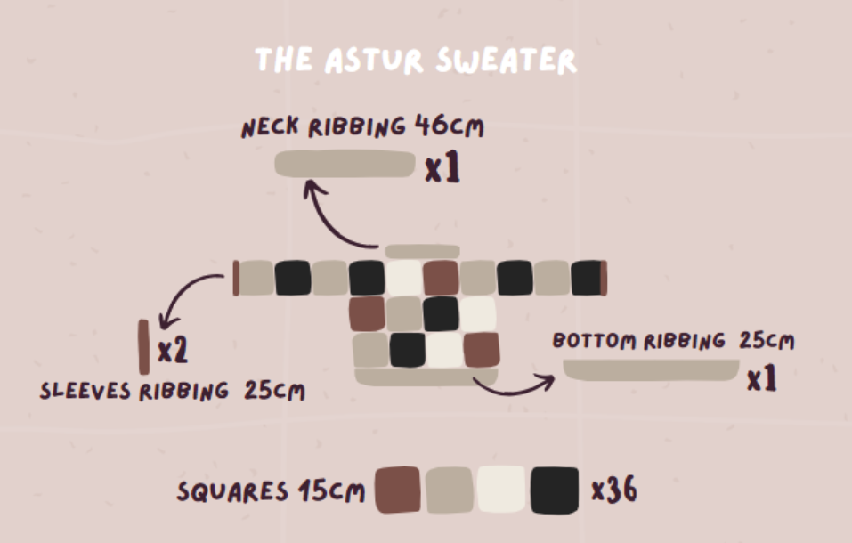 The PDF includes all the measurements and guides to make the Astur Sweater yourself. It doesnβt include different sizes for now.